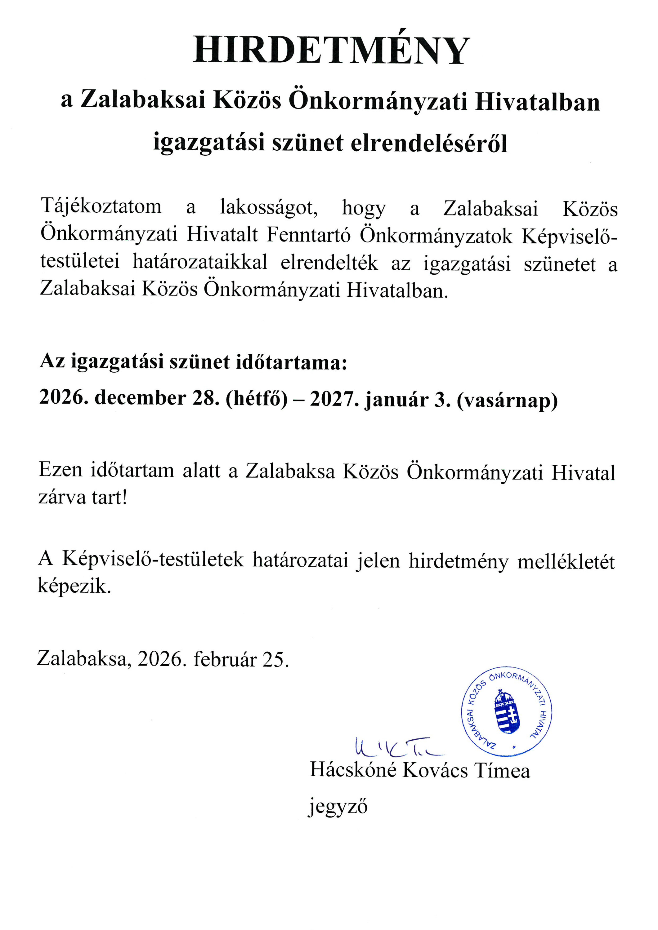 Igazgatási szünet 2026.